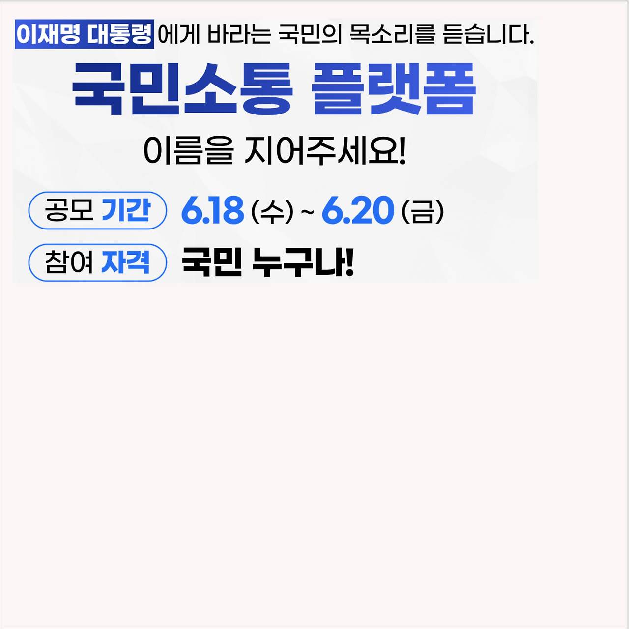 더불어민주당이 새롭게 선보이는 온라인 국민소통 플랫폼의 이름을 공모합니다. 정책을 국민의 목소리로부터 시작하겠다는 모두의 질문Q 프로젝트의 일환으로, 직접 국민이 이름을 제안하고 추천할 수 있는 소중한 기회입니다. 명칭 응모하기 명칭 후보보기 인기있는 명칭보기